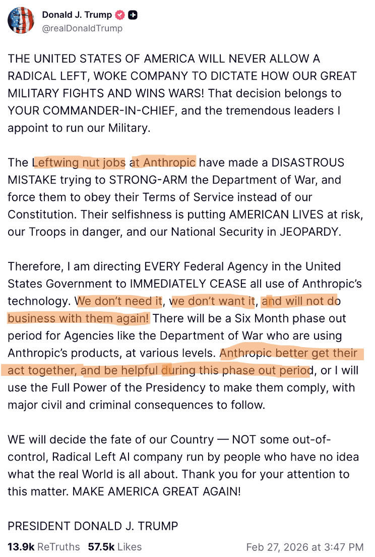 Given the rapidly accumulating warning signs about rogue AI, this seems like a legitimate question, and one worthy of careful consideration and debate. But it was instead shut down instantly by our U.S. president — who reacted as if the asking of such questions represented a personal betrayal of his own awesomeness. Donald Trump banned the company from all federal contracts, and went on a Truth Social freakout in which he threatened “criminal consequences” for the “Leftwing nut jobs at Anthropic”.